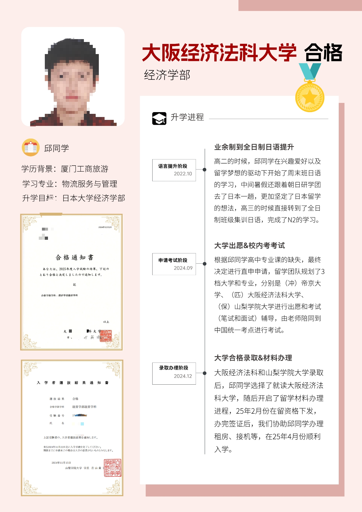 在申请与考试环节,我们提供了全流程闭环服务:从院校出愿材料的精准打磨,到笔试、面试的针对性专项辅导,再到陪同学员赴国内统一考点参加考试,每一个环节都有专业老师全程跟进,帮他规避申请风险,从容应对考核。最终,邱同学成功斩获大阪经济法科大学经济学部、山梨学院大学双录取,用实力证明了职校生也能圆梦日本优质本科。